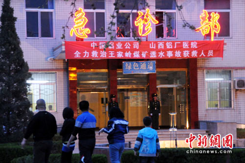 4月5日,几名市民走过山西铝厂职工医院门前,该医院目前安保已经大升级,出入都有武警等安保人员层层把关。截止目前,山西王家岭透水事故井下153名被困人员中已有115人获救。中新社发 刘冬 摄