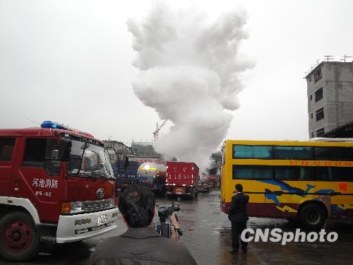 4月5日中午12时许,广西河池市都安县一停车场内,一辆大型槽罐车突然泄漏具有腐蚀性的液态氨。救援过程中,液氨从车顶阀门喷出,形成一朵高达十数米的蘑菇云,十分骇人。都安县消防大队接警后迅速出动12名官兵到场,并紧急疏散200多名周围民众。事故无人员伤亡。中新社发 李勤政 摄