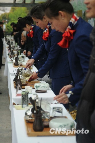 4月13日,第十三届西湖茶会在中国茶叶博物馆正式揭幕,茶博会准备了“绿、白、红、青、黑茶”五大基本茶类。市民可以赏鉴、免费品饮包括:西湖龙井、龙井茶、碧螺春、黄山毛峰、六安瓜片、信阳毛尖、等13种名茶。中新社发 引炜 摄