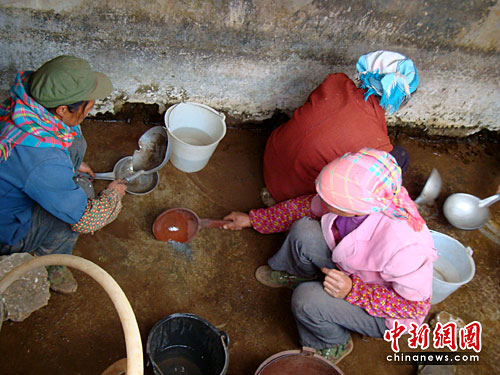 去年入秋以来,云南省遭遇了百年不遇的特大旱灾,截止目前全省已有888万人、1890万头牲畜饮水困难,全省农业直接经济损失超过180亿元。图为重灾区昆明市东川区阿旺镇蒿枝村民在村子里唯一的水源—一个接近干涸的小水潭,用水瓢刮取地面渗出的山泉水。中新社发 杨洋 摄
