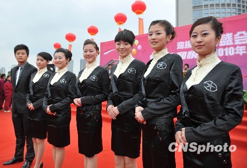 4月15日,安徽省首批形象大使在合肥正式启程奔赴上海服务世博,迎接四海宾朋,八方来客。中新社发 张娅子 摄