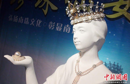 4月17日,一尊价值600万元人民币,佩以中国最大天然海水“南珠王”的“珍珠仙女”石膏作品,从广西北海启运上海世博会展馆。这尊制作耗时约2个月的“珍珠仙女”,头戴由228颗南珠、1880枚钻石和18K黄铂金镶嵌而成的“海之皇冠”,手擎一粒价值200万元、直径达1.12×1.55厘米的中国最大天然海水珍珠“南珠王”,身佩豪华珍珠项链及上万粒散珠。南珠产于中国广西沿海、雷洲半岛等地,以广西合浦出产的珍珠为南珠的上乘品,素有“东珠不如西珠,西珠不如南珠”之美誉。中新社发 朱辉 摄