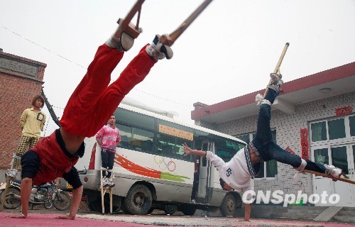 4月20日,河北省安新县增庄高跷艺术团小伙子们踩着65厘米的高跷,表演风车、单臂倒立、托马斯等高难度的街舞动作。图为队员表演“单、双臂倒立”。中新社发 翟羽佳 摄