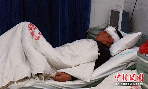 4月27日晚,福建顺昌一矿山发生爆炸事故,事故造成2死7伤,当场死亡2人为专业技术人员。图为头部受伤人员王先生接受医治后正在医院休息。事故过程为福建顺昌公安局对已收缴过期的非电雷管1924枚,硝铵炸药528公斤集中委托2家公司实施爆破销毁,技术人员在填装雷管过程中发生意外,500多公斤炸药所幸未发生引爆。中新社发 张丽君 摄