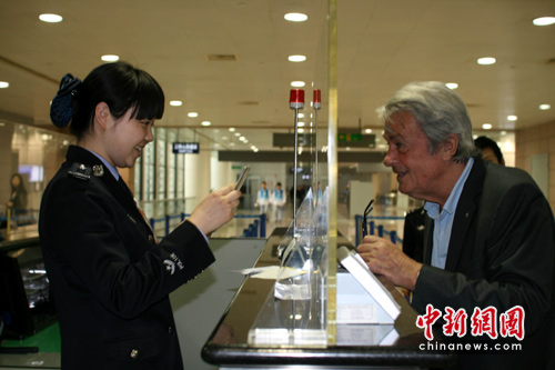 4月29日下午,一代巨星、“佐罗”的扮演者阿兰德隆乘坐法航抵达浦东国际机场。此次“佐罗”将坐镇上海世博园中的法国馆。作为法国馆的形象代言人,热情的阿兰德隆表示十分高兴有幸参加上海世博会开幕。当日下午,一身休闲打扮的“佐罗”戴着一付墨镜,岁月在他的脸上留下了印迹,但阿兰德隆还是一如既往的迷人,对周围的人也十分随和,有人请求合影时,总是主动地摘下墨镜,还问要不要停下来合影。 中新社发 刘友平 摄