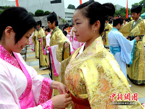 5月6日,来自福州市各地区及闽侯县的近500名中学生身着汉服参加在福建省昙石山遗址博物馆广场举行的“庚寅年福建闽侯县第三届传统成人礼”。该传统成年礼采取三加礼的形式,共分祭酒、初加礼、二加礼、三加礼、拜孔子、拜剪、拜称、成人宣誓等传统仪式。华夏民族自周代就有了成年礼,又称冠笄之礼,是古代社会第一大礼,也是人生中最重要的仪式。中新社发 刘可耕 摄