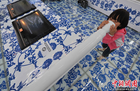5月6日,一名女孩在世博会的上海企业联合馆内参观机器人厨房,厨房采用青花瓷全面装饰,体现传统与现代交融美感。中新社发 贾国荣 摄