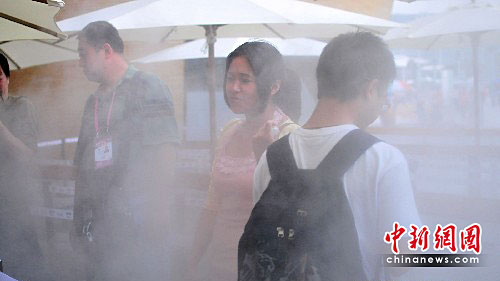 5月6日,世博园内的喷雾,为在闷热天气里排队等候进馆的游客带来丝丝凉意。据悉,整个世博园3.28平方公里围栏区内,喷雾系统覆盖面积超过了15万平方米。这些喷雾的雾滴直径以微米计算,堪比发丝。中新社发 李克祥 摄