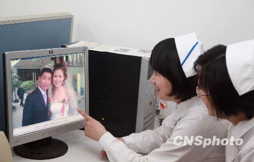 2008年汶川大地震中右小腿遭重创者程艳不得不被截肢,经过浙江人民医院爱心病房的医务人员精心治疗护理,很快返回生活工作中,今年发出结婚喜讯。图为爱心病房的医务人员争相看程艳的婚照。中新社发 吴懂科 摄