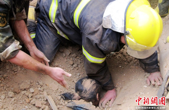 就在对右侧另一名被困妇女实施救援时,墙体突然发生倒塌,所幸发现及时,没有造成人员伤亡。为确保被困人员生命安全,教导员赖伦勇命令救援人员加紧对埋压物的清理工作,将泥士装上簸箕迅速运走,同时对被困妇女喊话安抚。又经过一番挖掘和清理,第3名被困人员被解救出来并迅速抬上救护车,送往医院接受治疗。