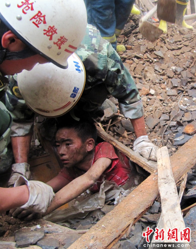 陆向前立即采取喊话的方式了解被困者的位置,不一会儿,从废墟里的2个位置传来了被埋者的微弱声音。“在这里!”一名被困妇女在内墙里面、一名小男孩在中间位置。