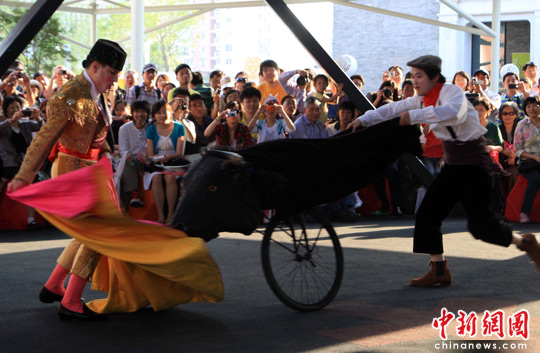 新近,上海世博园区里的各种趣味演出连连,西班牙斗牛士与一头假公牛相互角逐,让众多游客乐开怀。中新社发 潘索菲 摄