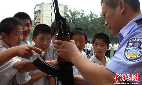 6月8日,为有效增强学生们对非法持有仿真枪、管制刀具危害性的认识,以净化校园环境。河北警方持长短“枪”,进入石家庄某中学开展宣传教育活动。图为该市桥东公安给学生们讲解“冲锋枪”有关知识。中新社发 翟羽佳 摄