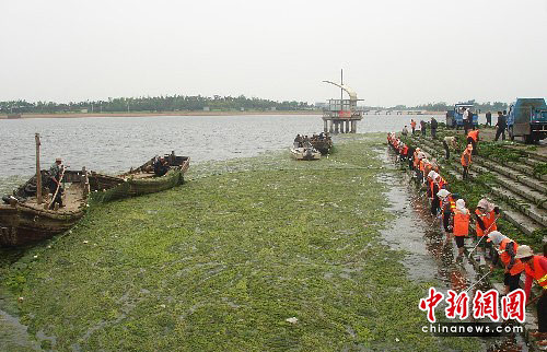 近日,山东省日照2010年中国水上运动会比赛水域聚集大量浒苔。经过几天的紧张清理,截止到9日下午,已清理浒苔1300多吨。据日照市海洋与渔业局环保科工作人员介绍,此次浒苔爆发的水域只在水运会比赛水域的泻湖内,近海并没有发现,预计随气候等环境改变,该水域浒苔将消失。目前,也已根据其发展情况采取了相应措施,确保不会影响到8月28日开幕的2010中国水运会比赛的正常举行。图为环卫工人正在利用渔船拉网清理浒苔。中新社发 党正林 摄