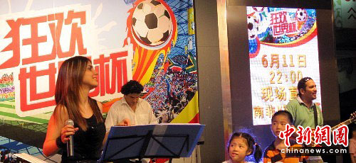 6月11日晚,一支来自“足球王国”巴西的乐队在上海著名时尚地标大宁国际商业广场,与上海居民一起迎接南非世界杯足球赛开幕。图为乐队的美女主唱邀请上海儿童一起表演。中新社发 姜煜 摄
