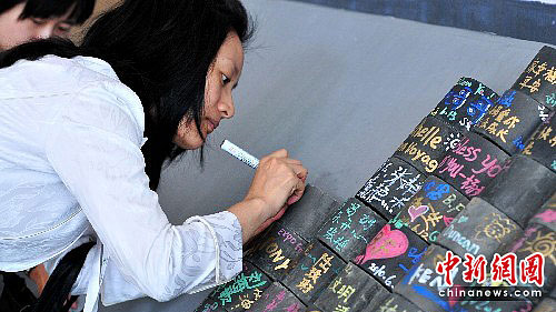 6月13日,苏州市民在“世博瓦”上留下祝福。“世博瓦”是上海世博会的一项创意,寓意为世博“添砖加瓦”。中新社发 李克祥 摄