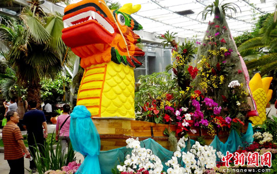 6月14日,正逢中国传统端午节之际 ,来北京植物园参观"端午花卉以及2010中国月季文化节"的游客络绎不绝。图为用鲜花组成的百花龙舟吸引游客。中新社发 钱兴强 摄