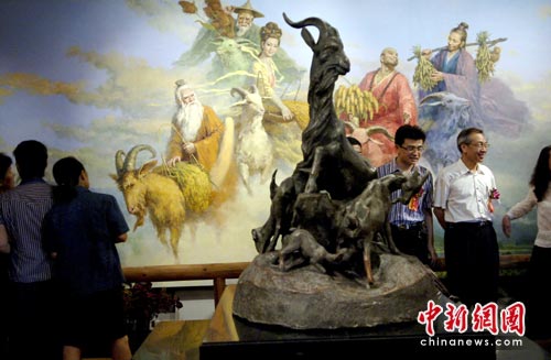 6月22日,由广东省著名油画家潘嘉俊创作的大型油画《五羊传说》在广州博物馆镇海楼前举行隆重入藏仪式。《五羊传说》以“五羊衔谷”神话传说为题材,以油画绘画为表现手法,是西方油画技艺与东方古老素材的一次激情碰撞和完美融合。 中新社发 刘卫勇 摄