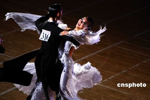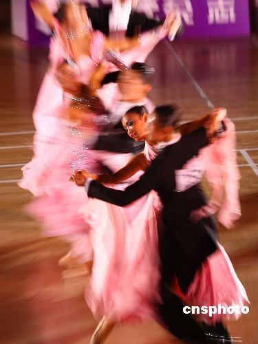 6月21日晚,作为北京市首届体育大会的开场赛事,2009“贝蒂杯”北京体育舞蹈公开赛在北京地坛体育馆举行,共有来自包括北京市舞蹈院校在内的几十对选手激烈角逐,亚洲室内运动会标准舞冠军沈宏梁、瑜洁,体育舞蹈国家队选手赵耀、陈贝等均在此次赛事中有精彩表现。中新社发 富田 摄