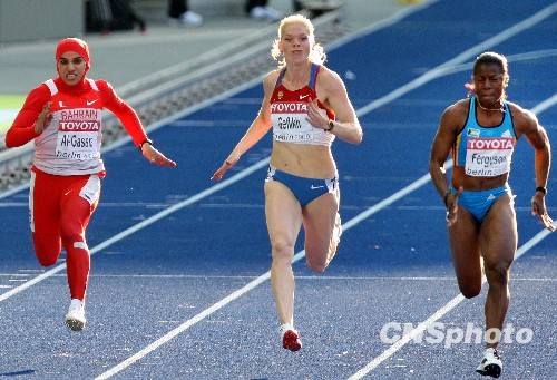 在第12届国际田径联合会世界田径锦标赛在柏林开赛后,气温一路高升,参加女子100米比赛的女选手均是清一色的超短装,唯独巴林选手AI-Gassra(左一)长衣长裤外加连衣帽。中新社发 任晨鸣 摄