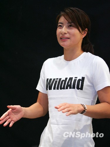 8月30日,美国野生救援协会携手奥运冠军郭晶晶,拍摄最新一季保护鲨鱼的公益广告片。广告片将于近期制作完成,并在全球范围宣传推广。图为在拍摄现场,郭晶晶身穿印有“Wild Aid--野生动物救助”字样的服装接受记者采访。中新社发 富田 摄