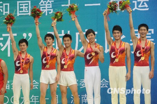 2009年10月13日,十一届全运会蹦床比赛第二天,在当晚结束的男子团体比赛中,福建队以157.30的总成绩夺得金牌。山东队和山西队分获二、三名。中新社发 张侃 摄