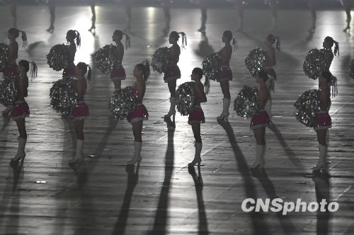 10月16日晚,中国第十一届全运会在济南开幕,美女团体操展现青春风采。中新社发 贾国荣 摄
