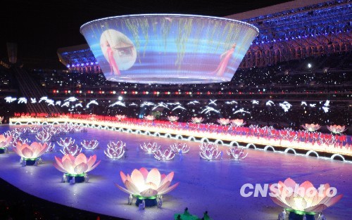 十月十六日晚,中华人民共和国第十一届运动会在山东济南开幕。开幕式表演再现泉城济南“四面荷花三面柳,一城山色半城湖”的迷人景色。中新社发 汤彦俊 摄