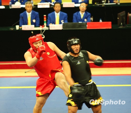 10月17日晚,第十一届全运会武术散打比赛男子87.5公斤以上级比赛在山东菏泽演武楼举行,河南选手陈彦召(红方)战胜对手获得金牌。中新社发 王中举 摄