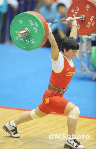 10月18日下午,河南选手李雪英在第十一届全运会女子58公斤级抓举、挺举赛中,以总成绩第一夺得冠军。中新社发 陈文 摄