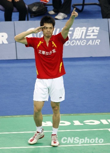 10月18日,第十一届全运会羽毛球男子单打决赛在青岛赛区举行,解放军队林丹以2:0胜湖南队鲍春来。图为林丹庆祝胜利。中新社发 张宇 摄