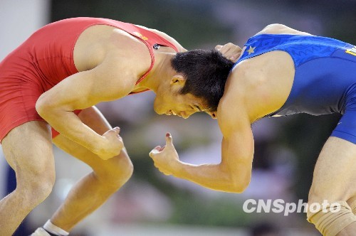 10月19日,北京选手高峰(红)在山东济南历城体育馆战胜广西选手覃和(兰),夺得第十一届全运会60公斤级男子自由式摔跤冠军。
