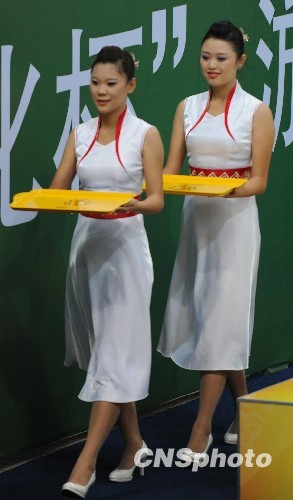 10月19日晚,在第十一届全运会游泳赛场颁奖仪式上的两名美女礼仪小姐,令观众赏心悦目。中新社发 王中举 摄
