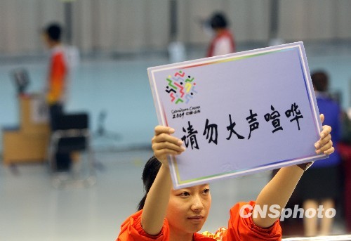 10月20日,在第11届全运会射击比赛中,场内志愿者高举“请勿大声喧哗”的牌子提醒观众注意赛场文明。连日来,在射击赛场上不少观众无视赛场纪律,大声喧哗,对运动员的比赛造成一定程度的影响。中新社发 汤彦俊 摄