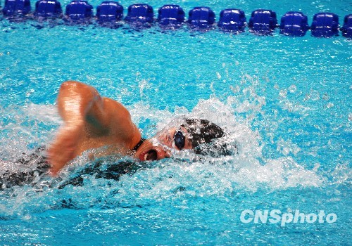 10月20日晚,山东济南,上海队选手十一届全运会男子4X200米自由泳接力在赛中,当天上海队以7分12秒22的成绩打破全国纪录夺冠。中新社发 王中举 摄