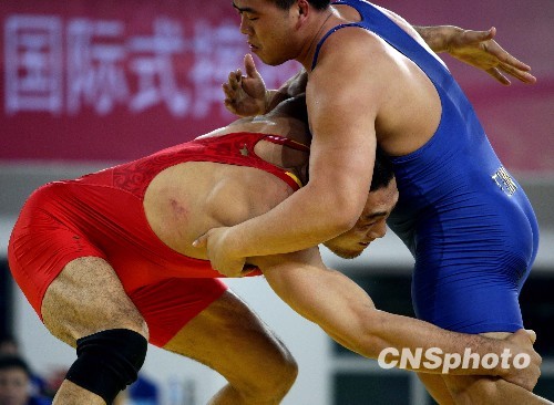 10月21日,十一届全运会自由式摔跤男子120KG级别决赛中,山西选手梁磊(红)仅用时5分多钟就战胜了解放军选手邓志伟(蓝)获得该级别冠军。中新社发 刘震 摄