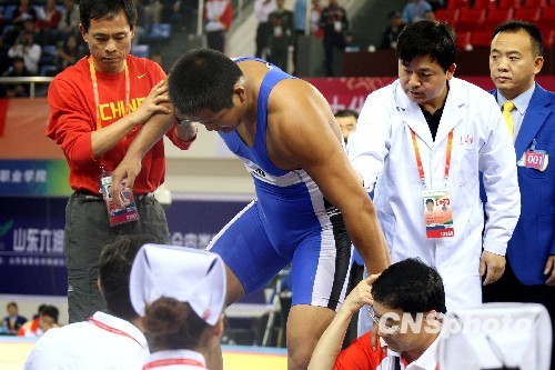 10月21日下午,男子自由式摔跤120KG级别的一场复赛中,比赛最后阶段,解放军选手唐小嘎意外受伤,在医务人员的短暂诊断后,队员离场治疗。图为队员在教练和医务人员搀扶下离场。中新社发 刘震 摄