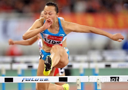 10月22日晚,四川选手刘静夺得第十一届全运会女子100米栏决赛冠军。中新社发 陈文 摄