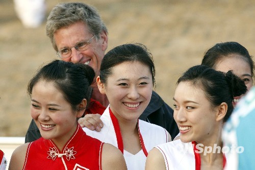 10月23日,第十一届全运会马术三项赛团体赛在山东济南举行,上海队最终获得冠军。图为上海队的“老外”成员赛后与美丽的礼仪小姐合影留念。中新社发 张宇 摄