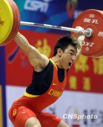 10月24日,在全运会男子举重69公斤级比赛中,代表解放军出战的奥运冠军廖辉以抓举163公斤、挺举195公斤、总成绩358公斤夺得冠军。总成绩超过了保加利亚选手波耶夫斯基保持10年的世界纪录1公斤。中新社发 汤彦俊 摄