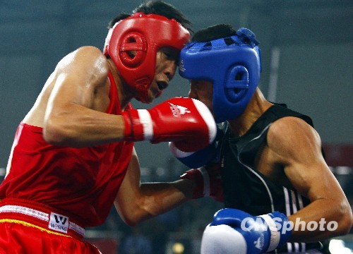 10月26日,十一届全运会拳击比赛在山东交通学院体育馆举行,811KG级别决赛中,在一对内蒙选手之间展开,结果张小平(红)战胜了孟繁龙(蓝)夺冠。中新社发 刘震 摄