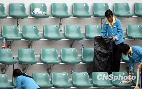 10月27日,清洁人员在济南第十一届全运会网球赛场清理赛后观众席垃圾。本届全运会各赛场赛后均是垃圾满地,甚是不文明。中新社发 张宇 摄