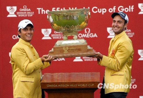十一月二十九日,二00九欧米茄观澜湖高尔夫世界杯落幕,经过四轮竞技,意大利高尔夫选手埃多奥多·莫利纳利 / 弗兰西斯科·莫利纳利(左)兄弟组合以总成绩负二十九杆夺得本届大赛冠军,赢得一百七十万美元的奖金。中新社发 陈文 摄
