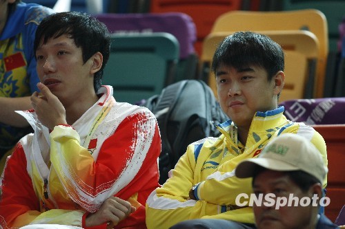 12月7日,香港东亚运动会乒乓球比赛进行最后一天的争夺,中国选手王皓(右)在看台上观看队友比赛。中新社发 盛佳鹏 摄