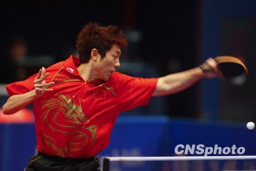 12月7日,2009年东亚运动会乒乓球比赛进入了最后一天的争夺,在男单半决赛中,中国选手许昕在比赛中战胜中华台北选手江宏杰晋级决赛。图为许昕在比赛中。中新社发 盛佳鹏 摄