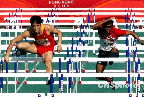 12月11日,东亚运进入第七天,中国“飞人”刘翔在香港将军澳田径场首次登台亮相,掀起一阵狂飙。当天上午九点四十分,刘翔将首次登台亮相,参加男子一百一十米栏的预赛,以十四秒零二领先。中新社发 洪少葵 摄