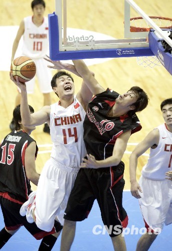 十二月十一日,东亚运男篮铜牌争夺赛在香港体育馆举行,中国队(白衣)以71:79负于日本队。图为两队队员正在激烈的比赛中。中新社发 张勤 摄