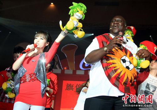 4月13日晚,中国版2010FIFA南非世界杯主题歌《旗开得胜》及其MV在深圳大剧院上演,它由歌神张学友以及海豚音天后张靓颖共同演绎的。当晚,张靓颖(左)与南非世界杯全球推广大使、非洲草根明星“啵乐哥”同台欢唱该曲,释放世界杯激情。中新社发 潘索菲 摄