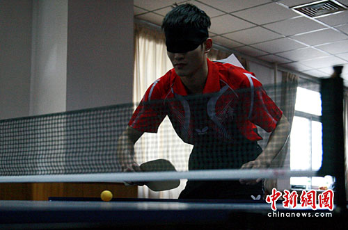 5月11日下午,中国首次设立的盲人乒乓球项目决赛在河北石家庄举行,来自天津的姚晓勇以2比1战胜北京的李学,成为中国第一位盲人乒乓球冠军。据了解,此次中国残疾人乒乓球锦标赛设置了盲人乒乓球项目,这是中国首次举办该项目比赛。图为姚晓勇比赛现场。中新社发 翟羽佳 摄