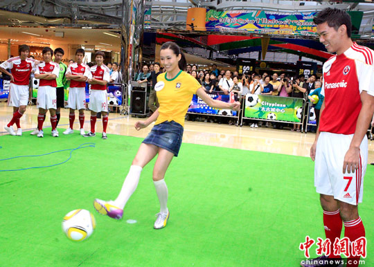 6月10日,为迎接2010世界杯盛事,香港一商家展出世界各地设计师为世界杯32支参赛队设计的足球,更推出风靡日本的足球游戏“人气九宫格”,并邀请香港女星陈法拉及6大足球明星陈肇麒、文彼得、欧阳耀冲、李威廉、梁倬轩、叶鸿辉出席启动礼。图为香港足球先生陈肇麒现场示范指导陈法拉踢球。中新社发 张勤 摄